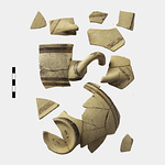 | Description: | Twenty-two sherds mended into four, non-joining fragments and two non-joining sherds preserving the complete profile to a linear deep bowl with flaring rim, two partially preserved horizontal, round-section handles, and a low ring base. The exterior decoration consists of a medium band beginning below the lip (stemmed bowl banding), and a group of lines running below the handle zone consisting of one to three visible fine lines bounded above and below by a medium band. The exterior of the ring base is painted with a medium band. The handles are tri-splashed. The interior is monochrome. The paint is thick and fairly evenly applied, fired dark brown. The base shows a fairly extreme use-wear on the interior from abrasion, likely due to use as a bowl. The exterior has some black staining that may be due to burning or just depositional (very dirty at the moment). Furumark Shape: 285 | |