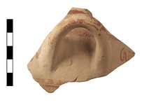 | Description: | Handle of Mycenaean vase, with a part of the rim. Bands of brown paint and some looped design form the decoration. Inside covered with red. | |