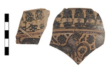| Description: | Fragments of yellow vase with black decorations. Two loose fragments. Band at top and below sphinx and other animals. | |