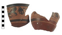 Red and black bands. Below rim a band with black figures of animals and one seated human figure.