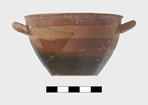 | Description: | One handle gone and part of rim. Red and black glaze with band unglazed. | |