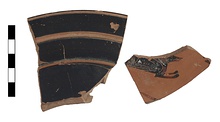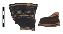 | Description: | Three fragments from open bowl with flared rim and raised red moldings. Central medallion has running animal with some white paint. | |