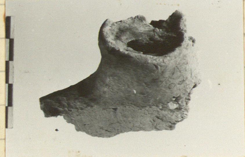 | Description: | Mold fragment with oval collar mouth with raised lip, and oval pour channel. Below a curved surface with flat edge. Mold for a bowl (?) Light yellow clay, burnt black in some parts. | |