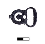 | Description: | Buckle and plate cast together. Elliptical buckle, pierced plate with chevron (?) ornament around edge. Three loops on back. Identical with B 167 but lacks the tongue. Cf. B 167 for published parallels. | |