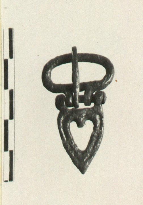| Description: | A small buckle, hinged, consisting of an oval with tongue and a heavier heart-shaped element decorated with a single groove. Attachment holes on the underside, one partly broken away. Cf. B 1268; cf. also Corinth XII, no. 2191, pl. 114. 7th c. A.D. | |