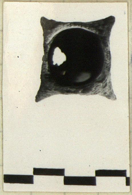 | Description: | Partly disintegrated on one side. Each of four sides concave, three are inscribed. Butt tapers at one end, hole for insertion of spear shaft on other. Bronze(?) | |