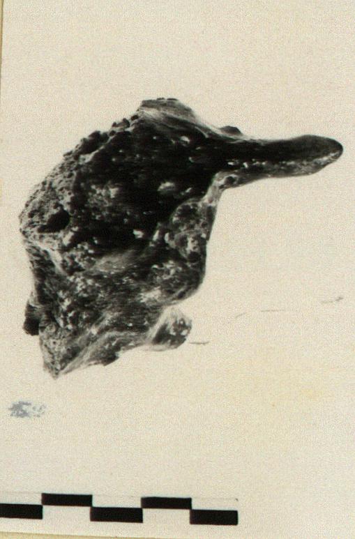 | Description: | Channel mouth or covering for channel mouth fluid vitrified black over exterior ending in drip. Black with green traces of bronze. Reddish clay. From bellows(?) Cf. B 1527 | |