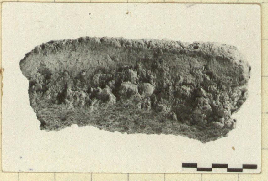 | Description: | Coarse red clay. One fragment preserving part of flat rim, heavily burned, and mostly covered with irregular layer of bronze, dripped towards edge. | |