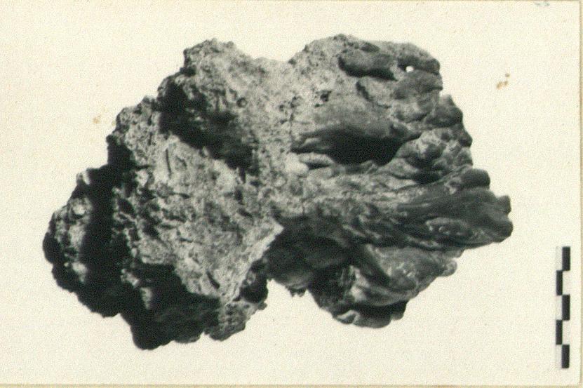 | Description: | Heavy piece of slag consisting of smooth sluggish gray to mauve drips, turning pink at ends originating at large irregular porous lump of orange to brown material which turns partly gray at base of dripped area. | |