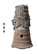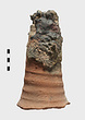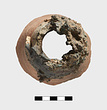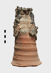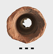 | Description: | Preserving most of slightly tapering amphora neck with hole near base of neck; upper 2/3 of neck coated with brown to black vitrified clay containing traces of bronze. Interior of base of neck blackened below hole. | |