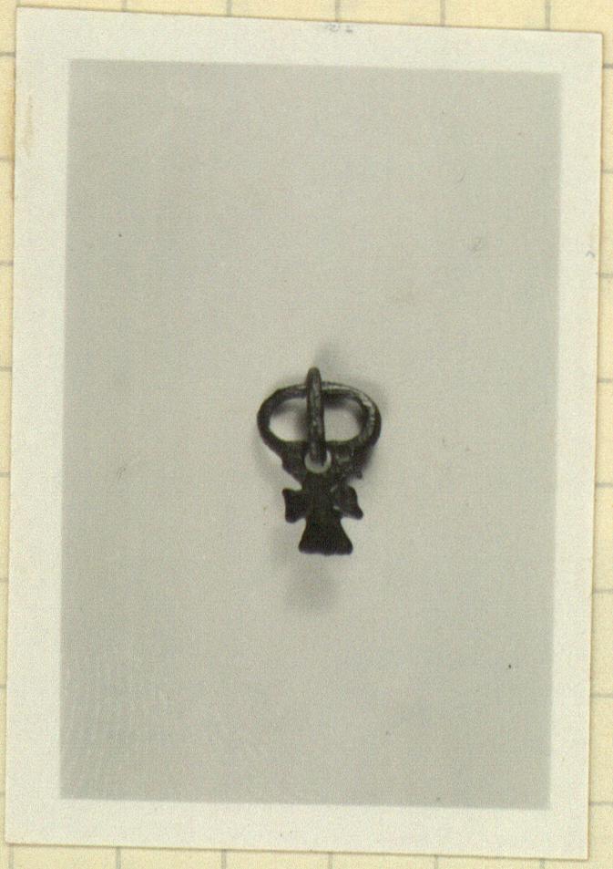 | Description: | A small buckle, cross-shaped, with a loop and tongue, and one loop for attachment behind. | |