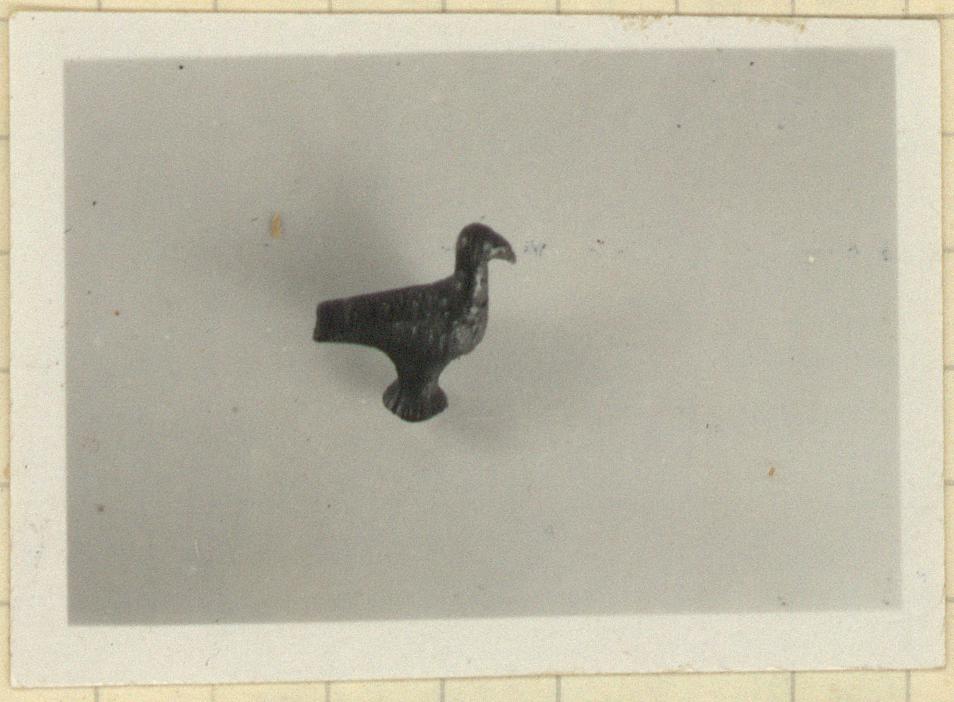 | Description: | The small bird stands with folded wings on a small round base. Base is broken off below. | |