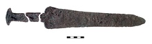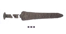 Description:   Broken in three fragments: at handle attachment and midway along hilt. Upper part of blade cracked. Three rivets preserved along hilt, two on widest area of blade. Seven complete studs (+one fragmentary) of which five have gold leaf wrapped around their rim are also preserved. On hilt two small fragments of gold leaf still attached.