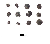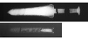 | Description: | Complete. Mended from three fragments. Corroded and cracked. Wide blade, tapering at handle end, wider at rounded tip. At handle end, two rounded protuberances edged with tiny flange. Two rivet studs for attachment of handle. | |