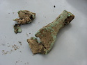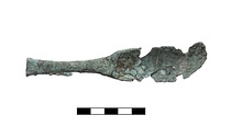 | Description: | Bronze strigil mended from several fragments. Extremely corroded, handle splitting, several gaps. End of scraper lost, most of handle preserved. Handle bent under into a loop. Terminal of handle adhered to bottom of scraper, it has a pointed shape with a small hole pierced through. One small fragment of handle not reattached. | |