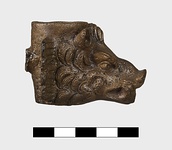 | Description: | A vertical opening runs through the back part of the head; and a smaller horizontal opening from the back of the head through the boar 's snout. Realistically modelled, with curling mane. | |
