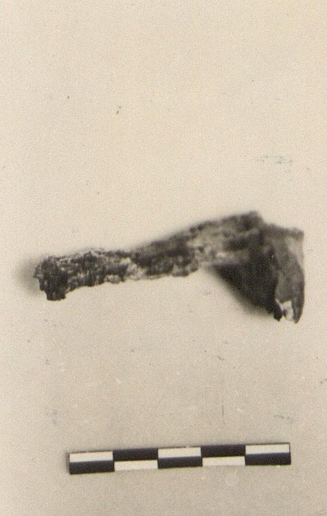 | Description: | Two thin rectangular plates , fastened by two rivets at each end, making double thickness. Possibly an ornament for a leather belt. | |