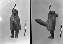 | Description: | Bearded figure wearing a short straight cloak from which the phallos which served as lamp nozzle projects. Filling hole in top of head. Pierced at the temples with a small hole throught which passes a bronze wire knotted together at the top for suspension. From the back of the neck project two lugs, pierced horizontally. | |