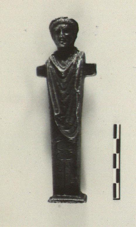| Description: | Intact save for chip from bottom of Herm, and another from the base. A portrait herm, draped. The hair is worn in a fringe of straight locks around the forehead, and bound by wreath (possibly a plain fillet), tied with two hanging ends behind. On the front, below the drapery, a caduceus, incised. The Herm stands on a small round moulded base, from which it has broken away; it apparently broken off also in antiquity, and was soldered on with some substance, much of which remains. Style of hairdressing suggests the time of Nero : possibly an imperial portrait ? Cf. B 882 for base. Cf. Hesperia 90 (2021), p. 399, n. 112. | |