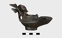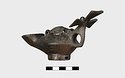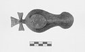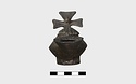 Large round nozzle. Shell-shaped cover over filling hole. Cross projecting above horizontal handle.