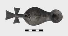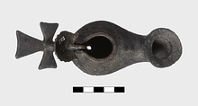 Two rings for suspension, one at the center of the cross, the other on neck between nozzle and filling hole.