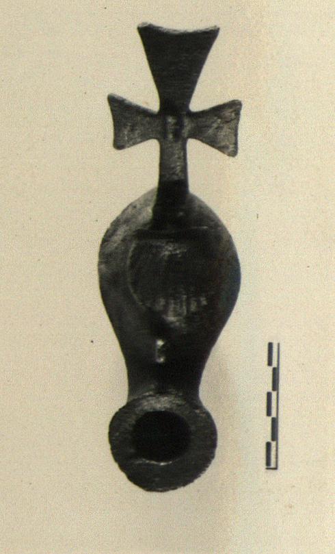 | Description: | Complete, though the hinge which holds the cover of the filling-hole is broken. High angular-bodied lamp on raised base. Large round nozzle. Shell-shaped cover over filling hole. Cross projecting above horizontal handle. Two rings for suspension, one at the center of the cross, the other on neck between nozzle and filling hole. | |