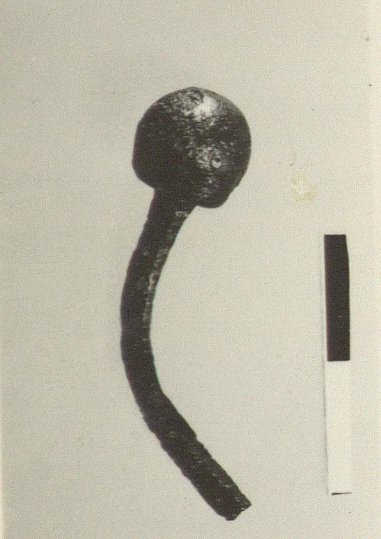 | Description: | Point and probably much of the shaft broken away. The head is almost spherical, flattened where it is attached. The shaft rectangular. A pin or a nail ? | |