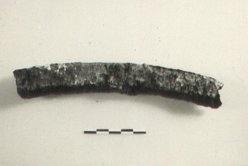 | Description: | Broken at both ends. Edge reinforcement with rivets for attachment of sheet bronze, curvilinear in plan; edge scalloped. Scalloped edge on concave side. | |