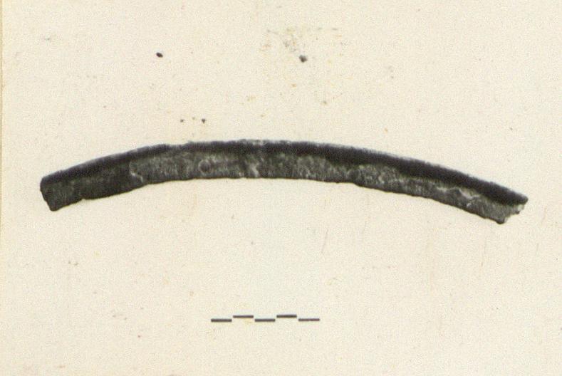 | Description: | Broken at both ends. Edge reinforcement with rivets for attachment of sheet bronze. Edge may have been scalloped as in B 908 but now much corroded. The curvature of this piece is the reverse of that of B 908. | |