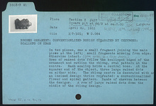 | Description: | An ornament with a conventionalized design separated by chevrons. It has scallops on edge. In two pieces, one a small fragment joining the main piece at the left ; small fragments missing from edge. Otherwise intact. Rows of raised dots follow the scalloped edges of the ornament and outline the oblong, oval pattern at the center. Each scallop holds a central boss. At the squarer end of the object, three large raised dots on either side. The oblong center is decorated with an incised design thrice repeated : a conventionalized flower and spiral pattern. Bands of chevron between the designs. A row of large raised dots down the middle of the oblong design. ADDENDA, February 2002: Small joining fragment missing. | |