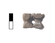 | Description: | Sheep or goat right astragalos. Worked knucklebone. Projecting points shaved flat on both top and bottom. Hole drilled through center. Brown bone. | |