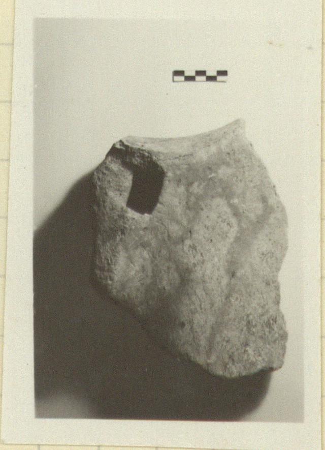 | Description: | The thin edge broken. A large shoulder blade, probably of a whale, with a rectangular cutting at the top. The broad surface shows marks of cutting. | |
