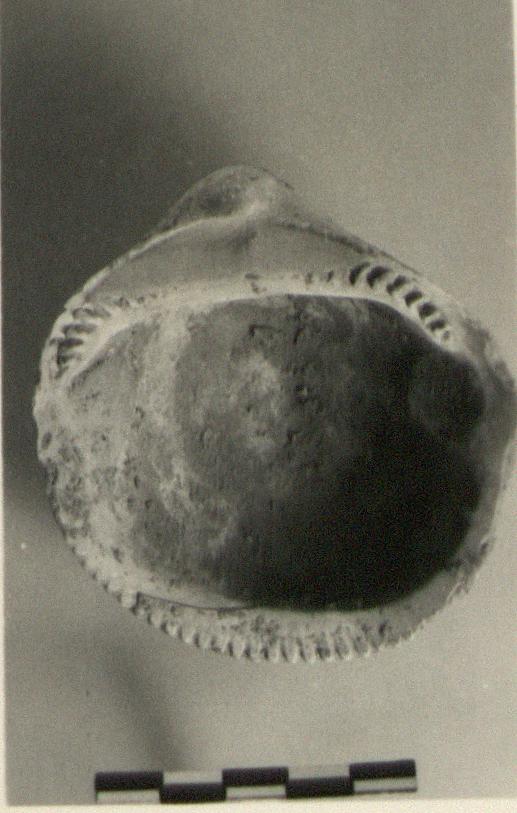 Description:   The shell of a large bivalve (according to D.S. Reese, 26 January 1984, is a marine Clycymeris), used as palette.
