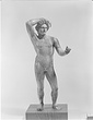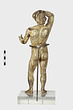 | Description: | Statuette of Apollo Lykeios. The head found largely complete; the body mended from over two hundred fragments. Small fragments from the torso missing; the front part of the left foot, the little finger of the left hand, and the first two fingers of the right. Surfaces perfectly preserved. Nude standing figure, the weight on the right leg, the left leg forward with the knee slightly bent. Tongues in the soles of the feet for insertion into a base. The left arm is outstretched, the right arm raised with the forearm resting on the crown of the head, the palm of the hand down, the fingers relaxed. The long curly hair is elaborately dressed, with a braid from the center of the forehead, and a large knot, with projecting curls, at the back. The head is bent slightly to the figure 's left. Probably belonging with this figure, possibly the base for the column which may have stood beside it, is the small round base from the same well, BI 247. Inside pieces not used for reconstruction with BI objects in Study Collections-Case Νo. 4-Δ | |