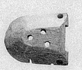 | Description: | A small object resembling the bowl of a spoon. Three holes pierced through the floor, and two grooves on either side. Rectangular projections at the "handle end", with holes for an attachment pin. For attachment to a box (?) | |