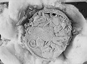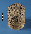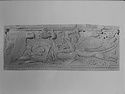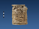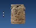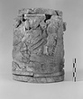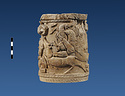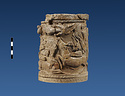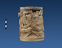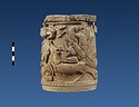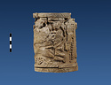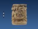 | Description: | Broken and split into many pieces, but largely complete; one side slightly higher than the other. A cylindrical box, tapering very slightly toward the top. The flat lid is held in place by a projecting central disk which fits down inside the wall. The bottom is made in two superimposed parts, one providing the actual floor of the box, the other, fastened to the first by ivory pegs, is a separate piece which provides a base for the whole. Traces of a metal lining, analyzed as tin, were found inside the box. The carved decoration, in fairly high relief, shows, on the lid, a griffin, crested, right, tearing two small deer. On the wall two similar griffins are represented at a larger scale, one right, the other left; they also are attacking deer both large and small. Considerably indications of a landscape backround. Close under the rim, two (?) horizontal lug-like handles, long, and slightly projecting, formed by the bodies of crouching animals; one of these fairly complete, the other fragmentary. Probably two pairs each formed by a lion and a deer. Pierced vertically. Border decoration at top and bottom, two zones of incised S-curved lines. | |
