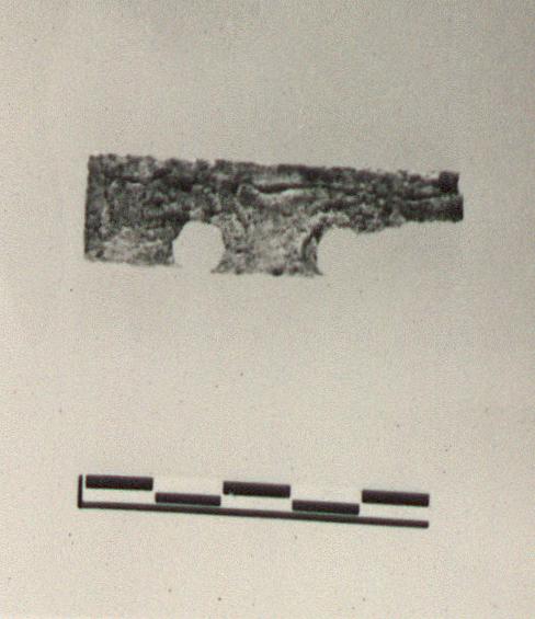 | Description: | An oblong plaque, dimensions full preserved, one corner missing. One side is rough, on the other traces of decoration in low relief. Along one long edge two holes rather less than a full circle, are cut through the plaque. "Probably the top of a comb, made with removable teeth" (S.A.I., 1964). | |