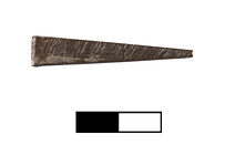 | Description: | Two joining fragments appear to preserve most of a thin small sharply tapering piece, broken at the tip. The top and sides are finished smooth; the underside is rougher. Ivory stained black throughout. | |
