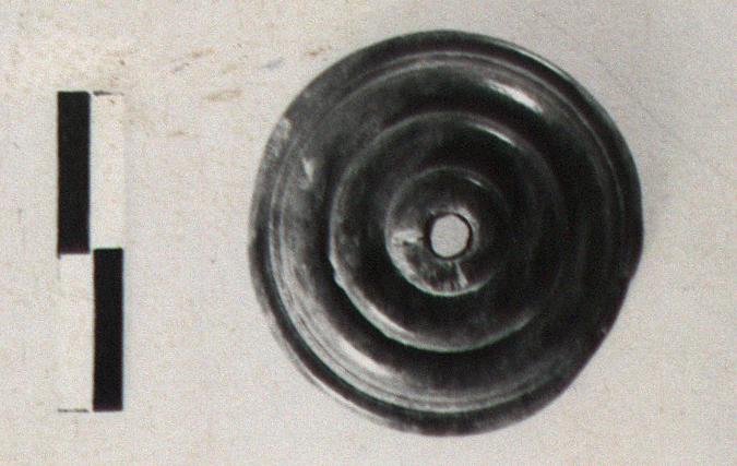 | Description: | Flat on one side, convex on the other. The flat side is grooved, the convex side ribbed. Round, with large hole through center. | |