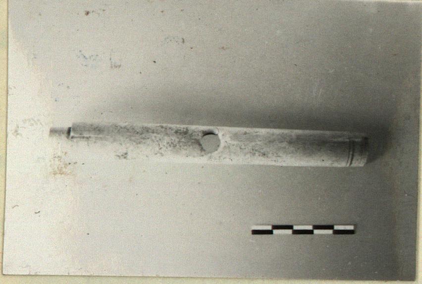 | Description: | Cylinder, flanged at one end to fit innermost piece. About two-thirds of the upper side split off; in the remainder two round stop-holes. On the other side another, about half way down the length of the piece. | |