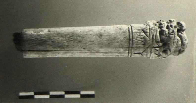 | Description: | Top section complete. From a staff or ferule, tapering slightly towards the lower end, in which are the remains of a pin for attachment. The top rounded, banded below with incised decoration and carved above; lion (?) | |