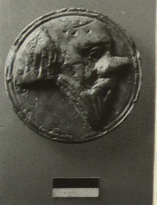 | Description: | A round flat one. On the top bordered by a pair of incised grooves, a satyr head (mask) right. On the underside, the number 9, scratched bilingually. | |