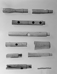| Description: | Tube intact except for chip from one end which caused crack. tube flares slightly, with rabbeting at small end to receive something outside and at large end to receive something inside. Section of flute (?) Cf. AJA 50 (1946), pp. 217-240. "Bell from an aulos, resembling similar instruments from MEROI, very large and with keywork". | |