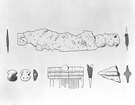 | Description: | Split and repaired; dimensions complete but teeth somewhat broken; a few fragments do not join. Rounded top, both faces lightly moulded, with a rounded band between light ridges. At the center top a neat rotelle rising above the edge. Ivory yellowed and somewhat stained. Late Helladic II-III. | |