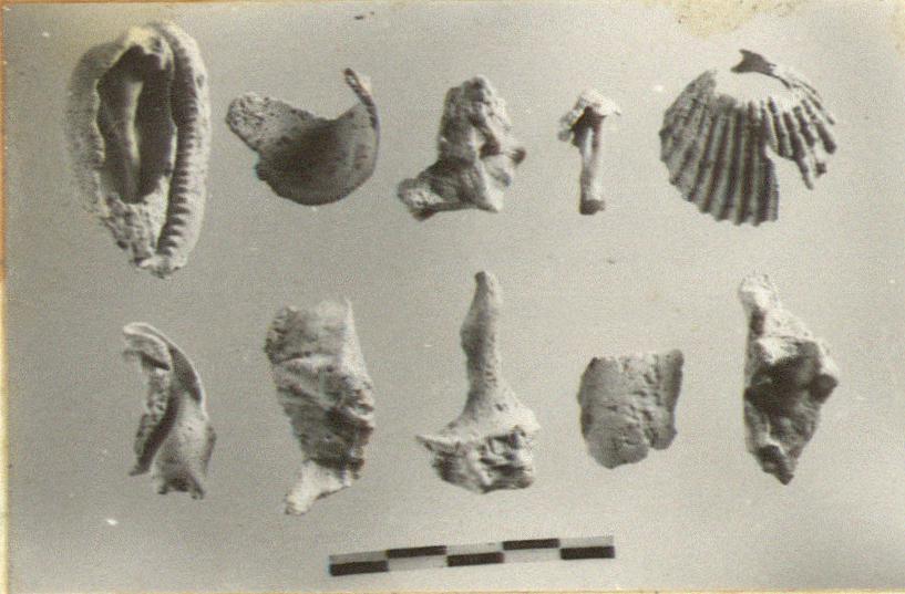 | Description: | Small cockle shell, small conch shell, and others, mostly fragmentary. "1 Cypraea shell, almost complete, no sign of being worked; shell associated with women. 2 Murex trunculus shells, large, very fragmentary (6 fragments). 3 Cardium edule, large, in fragments. 1 glycimeris glycimeris, large, it seems as smoothed at the edge. 1 land snail, Helix". | |
