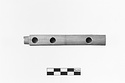 Section of flute with one end flanged for other section to fit against; three holes on one side, one on the other. Scratched lines around it, near holes, and a groove lengthwise down the side with the one hole.
