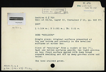 | Description: | Single piece; original surfaces preserved at top and bottom and probably in the bevelled surfaces at either end. Back and bottom surfaces smooth; two light grooves on top; front surface carved with deep broad concave moulding set off by deep grooves above and below. Piece of "moulding" from a casket or box (?) The bone stained green. | |