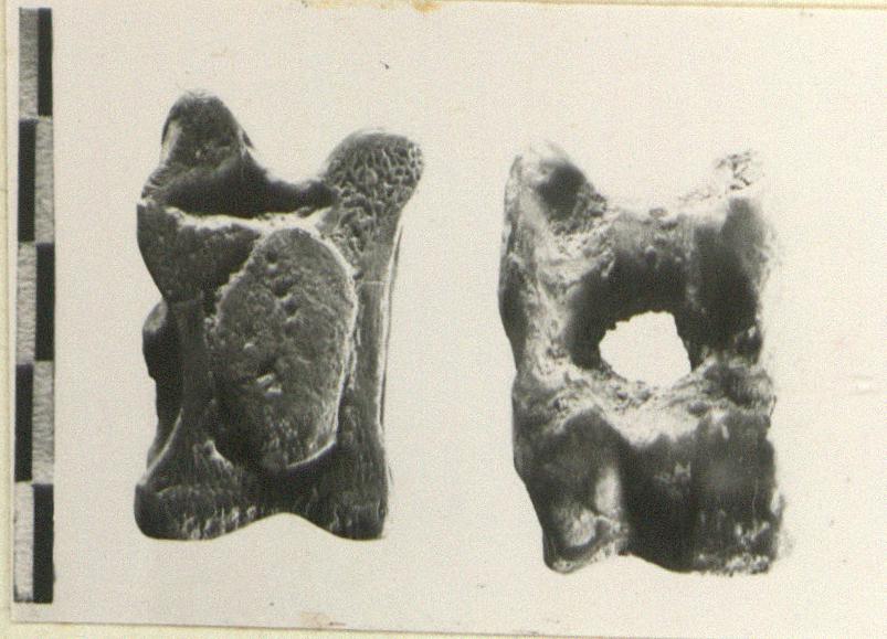 | Description: | Two fragments of split knukcle bones. Piece of lead inserted in one of them. | |