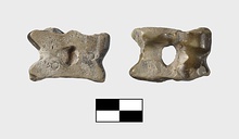 | Description: | Two fragments of split knukcle bones. Piece of lead inserted in one of them. | |