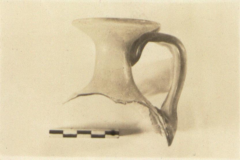 | Description: | Upper part of body with narrow neck, round flaring mouth, and deeply grooved handle. The tops of spiral grooves on the body. Pale green glass with air-bubbles. | |